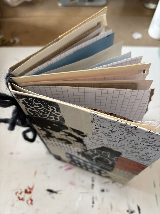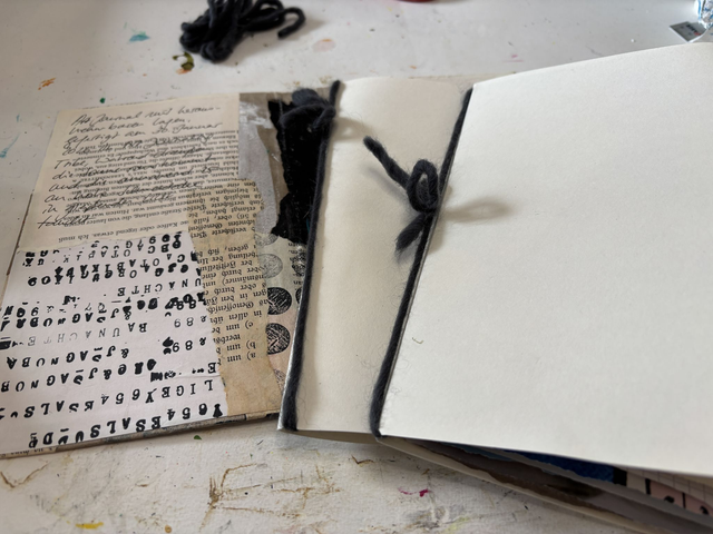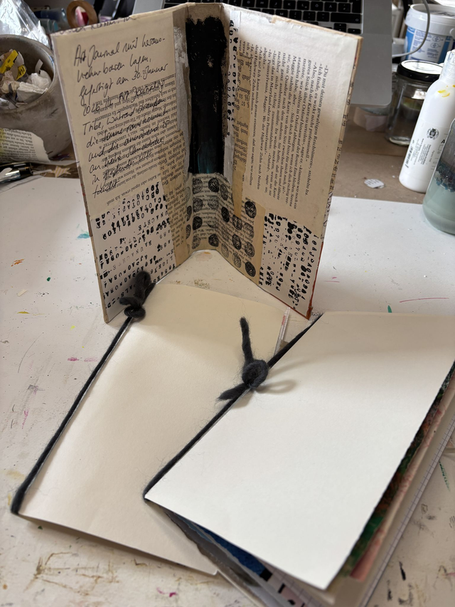 Es besteht aus einem mit Collage beklebten Bucheinband und 2 auswechselbaren Lagen aus verschiedenen Papieren. Dass du die einzelnen Papiere herausnehmen kannst, die Lagen um weitere Papiere ergänzen oder ganze Lagen austauschen, macht dieses Journal zu einem flexiblen Begleiter für viele Zwecke. Und wenn du magst, gestalte das Cover gern noch nach deinen Wünschen weiter.
