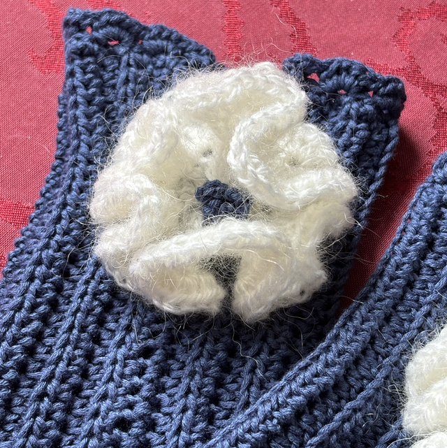 Gehäkelt aus Baumwollmischgarn (72% Baumwolle, 28% Modal), schmiegen sie sich wunderbar an und sorgen beim Tragen für Wohlgefühl. Die Blüte ist aus einem Mohair-Mischgarn (Mischverhältnis unbekannt, Restgarn)