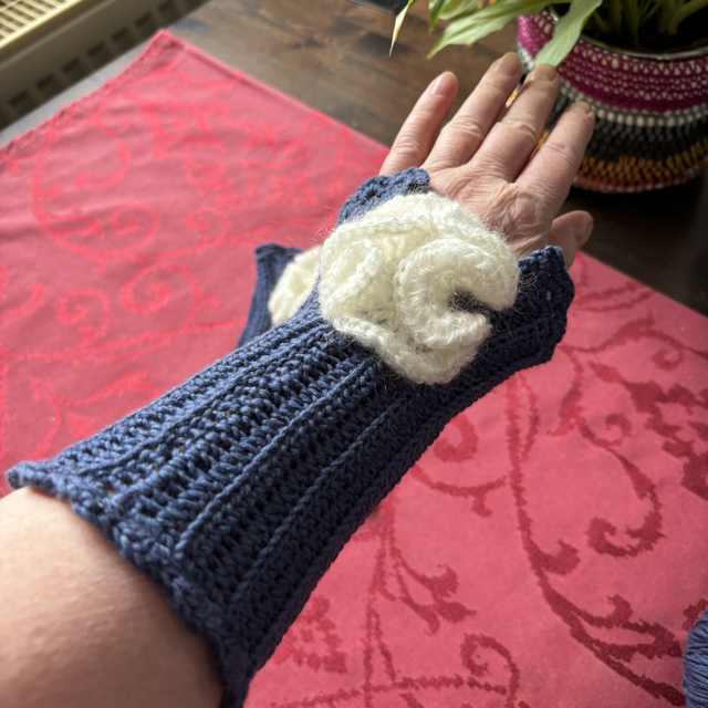 Dieses Paar Pulswärmer kommt mit dem gewissen Extra: einer Häkelblüte auf dem Handrücken!