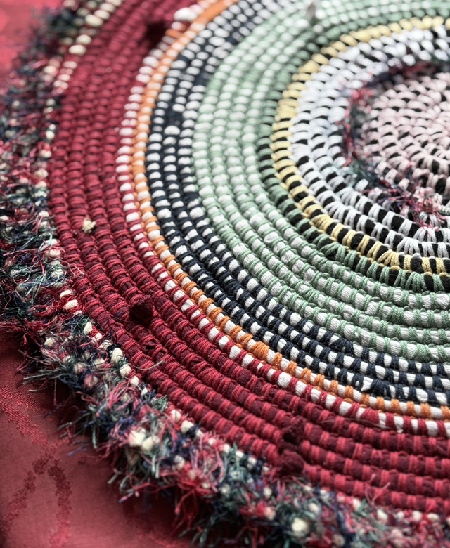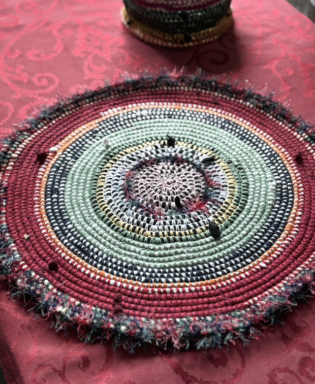 Upcycling-Unikat aus Stoffstreifen (Betttücher) und Häkelgarn - beides 100% Baumwolle - Umrandung mit Bärenpuschelgarn - waschbar bis 30 Grad